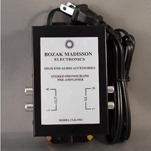 The Bozak Madisson model CLK-PH2 preamplifier converts phono signals to line-level using standard RIAA equalization. This is ideal for amplifying and EQing vinyl records to interface with mixers, main or monitor systems, audio workstations or sound cards. The CLK-PH2 has a very simple plug-and-play operation and works with all turntables that use magnetic cartridges. It will allow use of turntables on newer stereo receivers, amps etc., that do not have a designated "PHONO" input. Via their AUX, DVD, TAPE, CD Line Level inputs. Requires 117VAC (power cord attached).